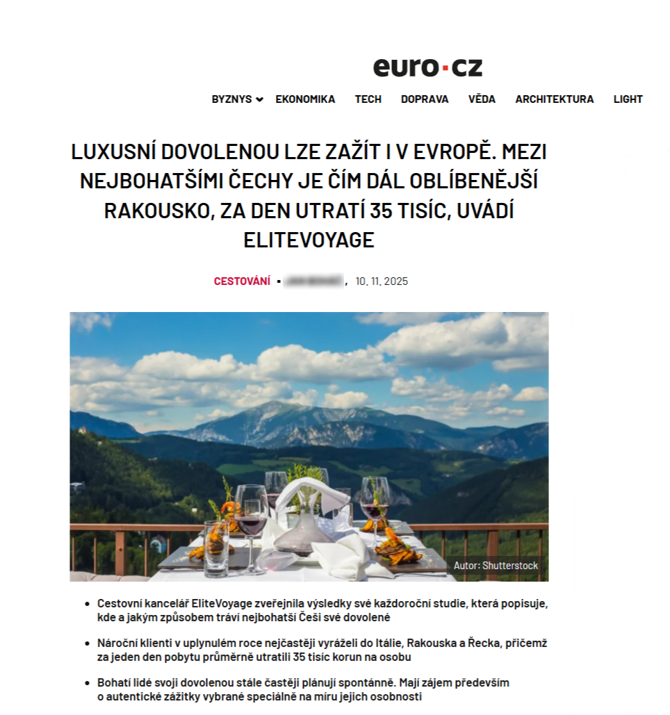 Od poloviny roku 2023 byla EliteVoyage zmiňována v minimálně 25 velkých výstupech ročně, za poslední půl rok spolupráce to bylo 20 výstupů s výrazně pozitivním či neutrálním sentimentem.